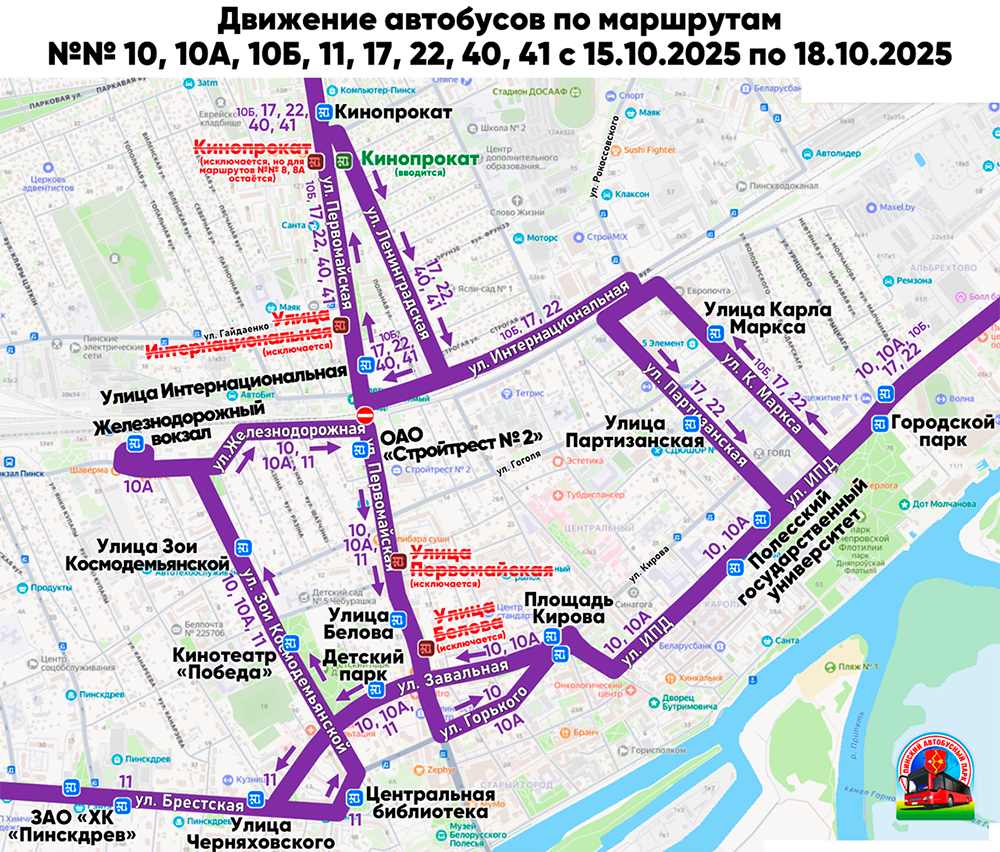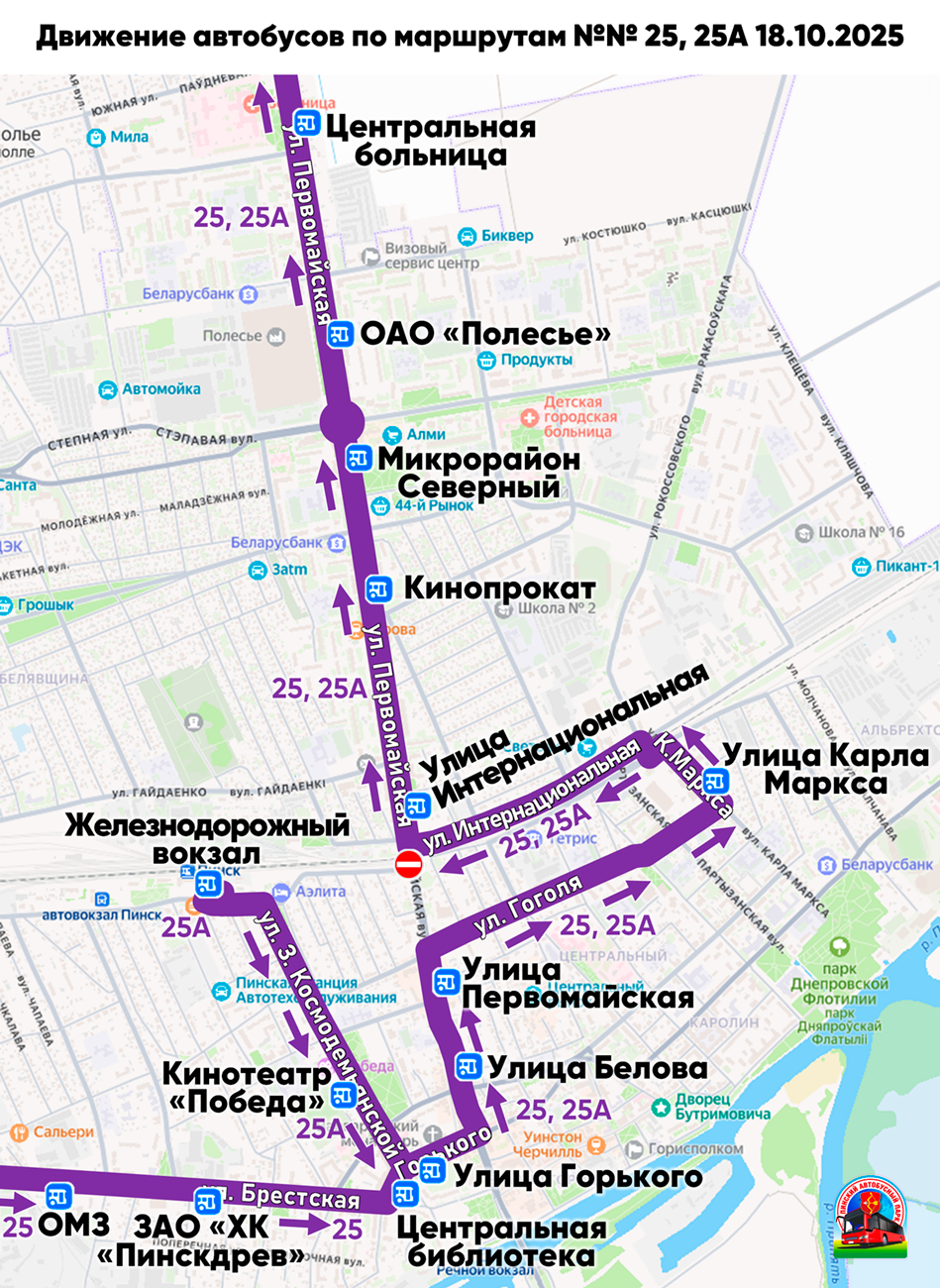 - маршруты №№ 25, 25А (кладбище д. Посеничи). После отправления от остановочного пункта «Улица Горького» автобусы будут следовать по схеме: Горького – Белова – Гоголя – Социалистическая – К. Маркса – Интернациональная – Первомайская и далее по маршрутам.
