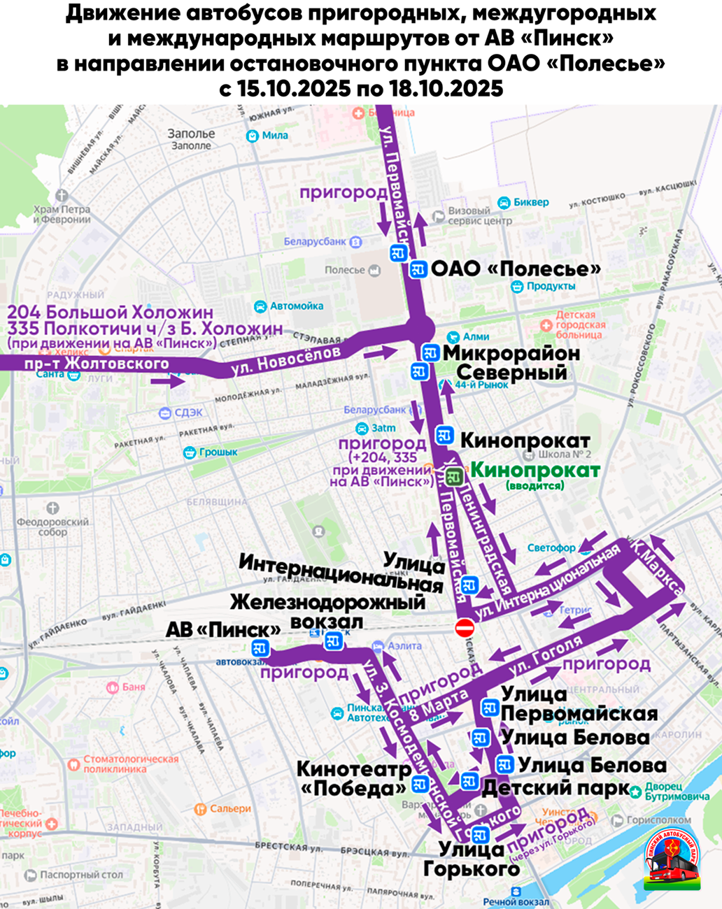 Автобусы пригородных, междугородных и международных маршрутов, следующих в направлении д. Посеничи, будут осуществлять движение по схеме: Автовокзал – Железнодорожная – З. Космодемьянской – 8 Марта – Гоголя – Социалистическая – К. Маркса – Интернациональная – Первомайская – автокасса на ул. Первомайской и далее по маршруту. Пригородные маршруты, у которых в расписании есть остановочный пункт «Улица Горького» вместо следования по ул. 8 Марта будут следовать с заездом на ул. Горького и Белова. При движении в направлении автовокзала автобусы будут следовать по схеме: Первомайская – Ленинградская – Интернациональная – Партизанская – Гоголя – Первомайская и далее по маршрутам.