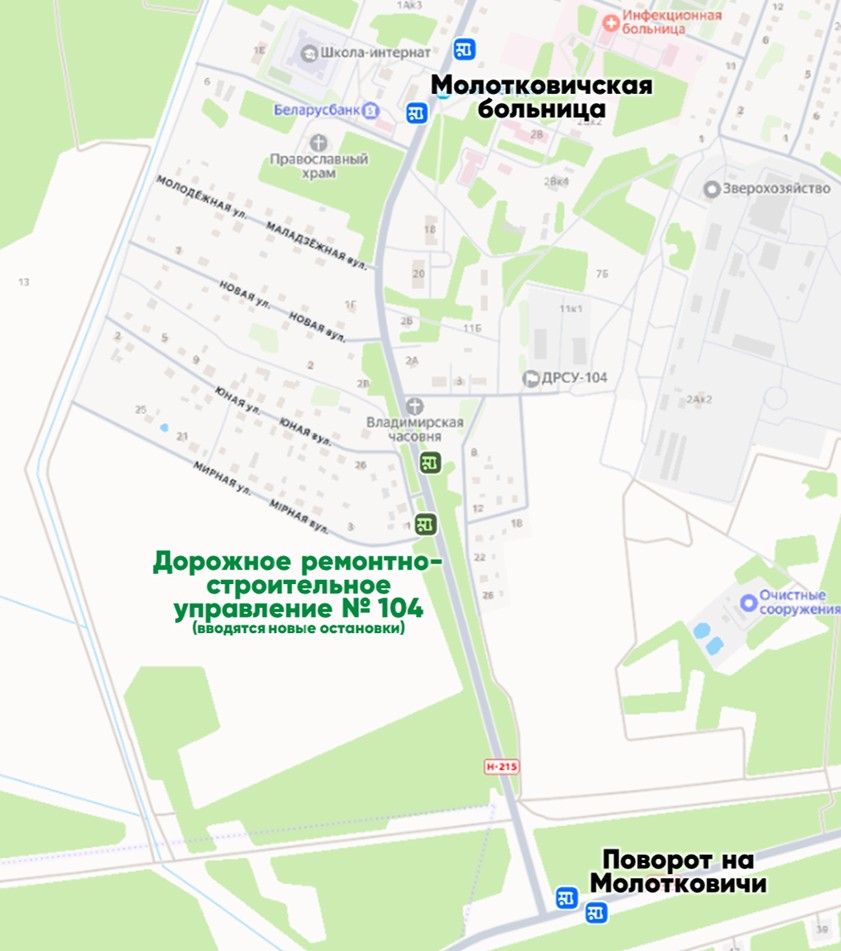 С 17.12.2025 в расписания движения автобусов по регулярным пригородным маршрутам №№ 239, 269 «Пинск – Молотковичи через Жабчицы»; 240, 268 «Пинск – Молотковичи через Домашицы»; 239 А «Пинск – Молотковичи через Жабчицы и Домашицы»; 269 А «Пинск – Молотковичи через Жабчицы и Залесье»; 347 «Пинск – Домашицы через Молотковичи»; 268 А «Пинск – Молотковичи через Домашицы и Залесье» в обоих направлениях вводятся остановочные пункты «ДРСУ № 104», расположенные по ул. Морозова в д. Молотковичи, в районе пересечения с ул. Мирной и ул. Юной.
