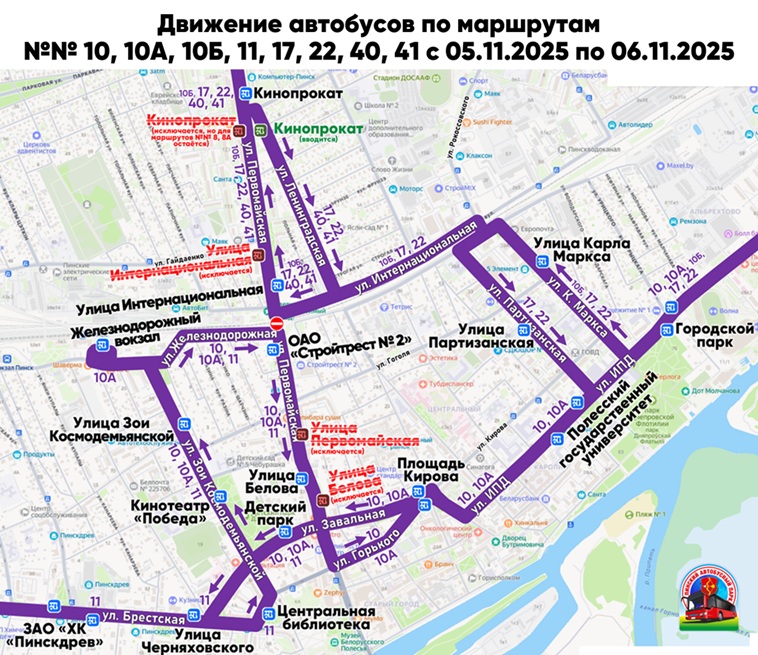 Исключаются из обслуживания остановочные пункты «Улица Белова» в направлении переезда, «Улица Первомайская» в направлении переезда – для маршрутов №№ 10, 11, 17, 22, «ОАО «Стройтрест № 2» и «Улица Белова» в направлении ул. Завальной – для маршрутов №№ 17, 22, «Улица Интернациональная» в направлении переезда – для всех маршрутов, «Кинопрокат» в направлении переезда – для всех маршрутов, кроме №№ 8, 8А.