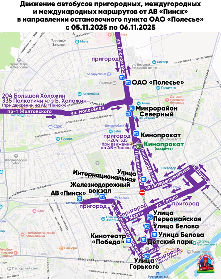 Автобусы пригородных, междугородных и международных маршрутов, следующих в направлении д. Посеничи, будут осуществлять движение по схеме: Автовокзал – Железнодорожная – З. Космодемьянской – 8 Марта – Гоголя – Социалистическая – К. Маркса – Интернациональная – Первомайская – автокасса на ул. Первомайской и далее по маршруту. Пригородные маршруты, у которых в расписании есть остановочный пункт «Улица Горького» вместо следования по ул. 8 Марта будут следовать с заездом на ул. Горького и Белова. При движении в направлении автовокзала автобусы будут следовать по схеме: Первомайская – Ленинградская – Интернациональная – Партизанская – Гоголя – Первомайская и далее по маршрутам.